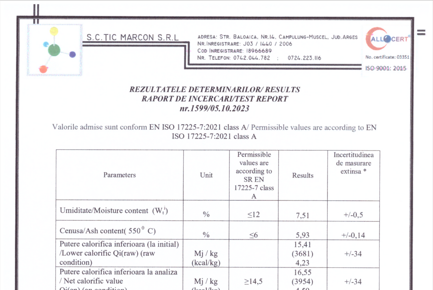 În urma analizelor fizico-chimice, brichetul BIOMASSER prezintă o valoare calorifică cuprinsă între 15 Mj/kg - 17 Mj/kg, cu un conținut de umiditate situat între 10% și 15%.